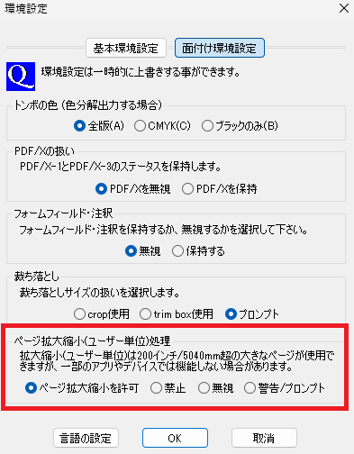 200 インチ(5040 mm)を超えるページに対応するPDF 機能です。ページサイズが5040mm の制限を超える場合、QI+ではすべての機能でページ拡大縮小/ ユーザー単位をサポートします。