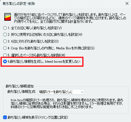 裁ち落とし部分を新たに作る場合、塗り足しを生成する機能が追加されました。拡大縮小または端部ミラーによって裁ち落としを生成します。 端部ミラー |
